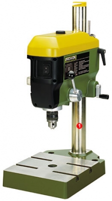 aus hochfesten Alu-Druckgussteilen. Praktischer Höhenverstellung über Zahnstange mit leichtgängiger Kurbel. Stabiler, stark verrippter, plangefräster Arbeitstisch mit T-Nuten. Leistungsstarker, langlebiger Gleichstrommotor. Spindelantrieb über 3-fach Riemenscheibe mit dem Vorteil des fast 6-fachen Drehmomentes im unteren Drehzahlbereich. Praktische Bohrtiefen-Anzeige mit einstellbarem Anschlag. Pinolen-Vorschub für gefühlvolles Arbeiten. Präzisionsgelagerte Bohrspindel. Spindelkopf mit 1/2''-Gewinde für das dazugehörende RÖHM-Zahnkranz-Bohrfutter (Industriequalität), aber auch zum Einsatz von Spannzangen.