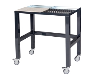 für Autogen- , E-Schweißen und Hartlöten, fahrbar 816 x 616 x 850 (LxBxH). Gestell aus 30 x 30 x 2 mm Vierkantstahlrohr fest verschweisst mit 4 Lenkrollen, Oberfläche 1/3 Schamott, 1/3 Rost mit unterem Löschtrog, 1/3 Arteitstisch aus Stahl nicht rostend.