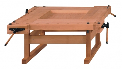 Arbeitshöhe 750 mm. mit 4 diagonal versetzten Vorderzangen, 4 Bankhakenleisten incl. 4 Paar Bankhaken. Werkbankplatte Buche massiv, 40 mm stark mit 90 mm hohem Umleimer zur Verstärkung mit integrierter Bankhakenleiste. Mittig der Platte eine Beilade zur Werkzeugabalge. Platte zahnverleimt, aus gedämpftem Rotbuchenholz, Oberfläche fein geschliffen und imprägniert. Spanzangen mit seitenstabiler Stahlflachführung aus einer Stahl/Grauguss