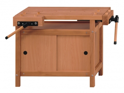 Durch einfaches Einstecken und Verschrauben der mitgelieferten Verlängerungen ist die Höhe der Hobelbankplatte von 640 auf 740 mm verstellbar. Inkl. Bankhaken aus Holz und Unterbauschrank mit Schiebetüren.