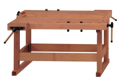 Arbeitshöhe 860 mm. Parallel spannende Vorderzangen mit seitenstabiler Stahlflachführung aus einer Stahl/Grauguss Konstruktion und Flachgewindespindel zur gleichmäßigen Druckverteilung. Hinterzangen mit nachstellbarer Kastenführung. Mit 2 Bankhakenleisten incl. 2 Paar Bankhaken. Werkbankplatte Buche massiv, 40 mm stark mit 100 mm hohem Umleimer zur Verstärkung mit integrierter Bankhakenleiste.