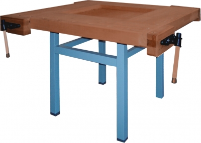 mit 4 längsseitig, diagonal versetzten Vorderzangen, 4 Bankhakenleisten incl. 4 Paar Bankhaken. Werkbankplatte Buche massiv, 40 mm stark mit 90 mm hohem Umleimer zur Verstärkung mit integrierter Bankhakenleiste. Mittig der Platte eine Beilade zur Werkzeugabalge. Platte zahnverleimt, aus gedämpftem Rotbuchenholz, Oberfläche fein geschliffen