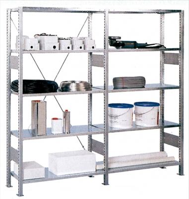 Fachböden mit 3-fach Sicherheitskanntung, 30 mm hoch, höhenverstellbar über Bodenträger im Abstand von 25 mm, Längstabilisierung durch Diagonalstreben.