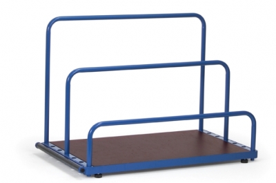 Profilstahl und Stahlrohr geschweißt, pulverbeschichtet, Holzplattform. 6 Verstellmöglichkeiten für Einsteckbügel. 4 Gummifüße, Bodenverankerung möglich. An einer Stirnseite eine sechsteilige Anlaufrolle. | |||