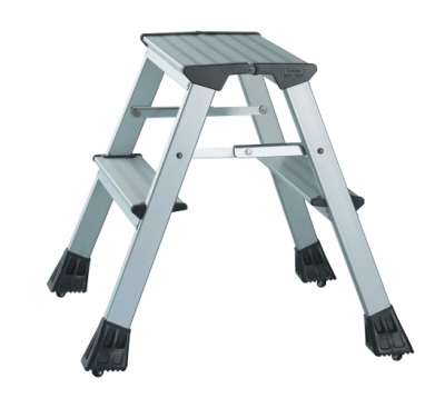 Standhöhe 45 cm, Standfläche 20 x 34 cm, aus stabilem Aluminium, klappbar, 4 bewegliche Gleitrollen, die sich bei Belastung absenken und sicheren Stand bieten, 360° drehbar, alle Kanten mit Kunststoffkappen, Gewicht 2 kg, DIN 4569, TÜV/GS.