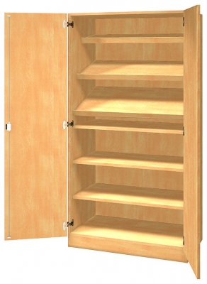 aus Dreischicht - Feinspanplatte E 1. Seiten- Mittel- und Rückwände fest verdübelt und verleimt. Türen mit umlaufender 2 mm ABS-Sicherheitskante, 270° öffnend, mit Drehstagen - Zylinderschloss und 3-fach Verriegelung. Einlegeböden mit Sicherheitsbodenträgern, über Reihenlochbohrungen im Raster von 32 mm verstellbar. Schrankhöhenverstellung über Sockelverstellfüße zum Ausgleich von Bodenunebenheiten.
