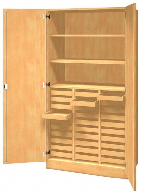 aus Dreischicht - Feinspanplatte E 1. Seiten- Mittel- und Rückwände fest verdübelt und verleimt. Türen mit umlaufender 2 mm ABS-Sicherheitskante, 270° öffnend, mit Drehstagen - Zylinderschloss und 3-fach Verriegelung. Einlegeböden mit Sicherheitsbodenträgern, über Reihenlochbohrungen im Raster von 32 mm verstellbar. Schrankhöhenverstellung über Sockelverstellfüße zum Ausgleich von Bodenunebenheiten.