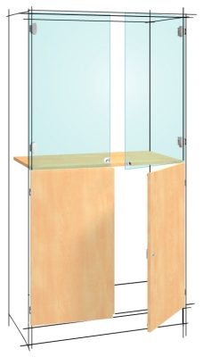 Ober- und Unterteil der Türen zu separaten Türpaaren getrennt. Oberteil 2 Glastüren aus 4mm Sicherheitsglas, Unterteil 2 Holztüren. Türen mit umlaufender 2 mm ABS-Sicherheitskante, 270° öffnend, mit Drehstagen - Zylinderschloss und 3-fach Verriegelung.