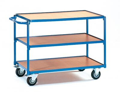 aus Stahlrohr und Profilstahl geschweißt, pulverbeschichtet, Schraubkonstruktion. Böden bzw. Kästen aus Holzwerkstoffplatte, Oberfläche Buchendekor. Böden mit 12 mm hohem Rand. 2 Lenk- und 2 Bockrollen mit Vollgummi-Bereifung. Naben mit Rollenlager. Feststeller an den Lenkrollen gemäß EN 1757-3.