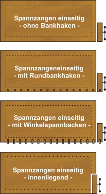 Abb. mit innenliegender Spannzange, flächenbündige Frontplatten der Spannzangen, Bohrungen für Rundbankhaken, Abstandhalter und höhenverstellbarem Untergestell - ZUBEHÖR.