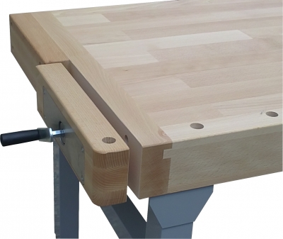 stirnseitig diagonal angebracht. Werkbankplatte Buche massiv, 45 mm stark mit einer umlaufenden 90 mm hohen Verstärkung, keilverzinkt und traditionell mit der Werkbankplatte formverleimt. Oberfläche geschliffen und imprägniert. Stirnseitige 90mm hohen Aufdopplungen zur Aufnahme und Druckentlastung der Zangenführung. Spannzange mit abnehmbarer Spannkurbel oder festem Spannstock. Zangenführung aus Grauguß, mit 2 Spezialführungsstangen und 1 Spezialgewindespindel, Gewindespindel mit Innensechskant. Untergestell aus Vierkantstahlrohr 60x60x2, in RAL-Farben nach Farbkarte. Zusätzlich eingeschweißte Querstreben für höchste Stabilität. Gestellfüße mit Kunststoffschonern und Tarierschrauben.