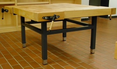 mit vier längsseitig, diagonal versetzten Vorderzangen. Werkbankplatte 2-tlg. in Buche massiv, 45 mm stark mit einer umlaufenden 90 mm hohen Verstärkung, zahnverleimt aus gedämpftem Rotbuchenholz. Spannzangen mit 2 Führungsstangen und einer Gewindespindel aus einer Stahl/Grauguss Konstruktion für paralleles Spannen sowie gleichmäßige Druckverteilung. Untergestell aus Vierkantstahlrohr 60x60x2, in RAL-Farben nach Farbkarte. Zusätzlich eingeschweißte Querstreben für höchste Stabilität. Gestellfüße mit Kunststoffschonern und Tarierschrauben.