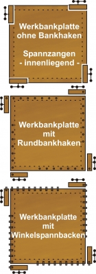 - Spannzangen außenliegend oder innenliegend, in Werkbankplatte integriert.