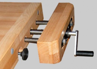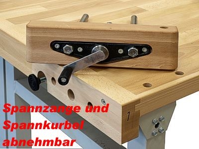 stirnseitig diagonal angebracht. Werkbankplatte Buche massiv, 50 mm stark, keilverzinkt, Oberfläche geschliffen und imprägniert. Stirnseitig mit 90mm hohen Aufdopplungen zur Aufnahme und Druckentlastung der Zangenführung, traditionell mit der Werkbankplatte formverleimt. Auf Wunsch auch austauschbar über Nut- und Federverbindung mit der Werkbankplatte verbunden. Spannzange mit abnehmbarer Spannkurbel oder festem Spannstock. Spannzangen abnehmbar, mit 2 Führungsstangen und einer Gewindespindel aus einer Stahl/Grauguss-Konstruktion für paralleles Spannen sowie gleichmäßige Druckverteilung. Inkl. Zangenhalterung unter der Werkbank bei Nichtgebrauch. Untergestell aus Vierkantstahlrohr 60x60x2, in RAL-Farben nach Farbkarte. Zusätzlich eingeschweißte Querstreben für höchste Stabilität. Gestellfüße mit Kunststoffschonern und Tarierschrauben.