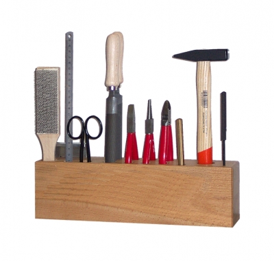 Aus Buche massiv, mit Bohrungen und Ausfräsungen, passen zu den Werkzeugen.