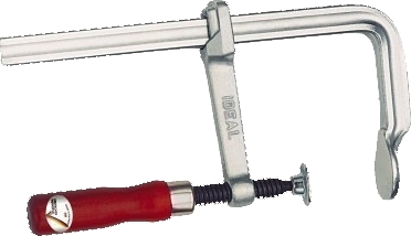 deutsches Fabrikat mit schweren Spannarmen. Festbügel aus kaltgezogenem Profilstahl, vergütet, Gleitbügel gesenkgeschmiedet, vergütet, verzinkt, Druckplatte kaltfließgepreßt. Brünierte Spindel mit Holzgriff, beweglich gelagerte Druckplatte.