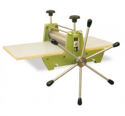 sehr solide mit extra langem Drucktisch. Seitenteile aus hochbelastbarem, formstabilen Aluminiumguss. Untere Walze über 4-Sterne Rad angetrieben. Abstand und Druck der massiven Stahlwalzen geregelt über zwei große Gewindespindeln. Obere Walze  starr gelagert. Dreizehnfach  verleimter Holzdrucktisch (Multiplex) mit einer elektrolytisch verzinkte Stahlplatte (jeweils mit Anschlag), präzise und reibungsarm auf 8 Rollen gleitet.