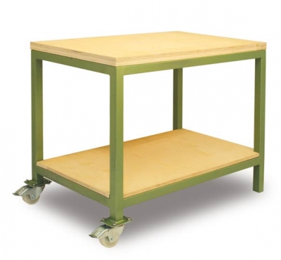 Untergestell in stabiler Vierkantstahlrohrkonstruktion, 45x45x2 mm, links mit 2 Lenkrollen feststellbar, rechts freistehendes Fußgestell.