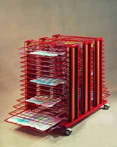 mit 30 Rosten zur Ablage großformatiger Bilder. Es befinden sich je 2 Roste auf einer Ebene, die gegeneinander eingeschoben werden. Dadurch entsteht eine große Fläche, die zur Ablage von einem Format DIN A2, bzw. zwei DIN A3-Formaten bzw. vier DIN A4-Formaten variabel genutzt werden kann. Fahrbar auf 4 Rollen, zwei davon feststellbar. Korpus und Roste sind aus pulverbeschichtetem Metall, daher schlag- und kratzfest. Roste werden in ausgefräste Holzführungen eingeschoben.