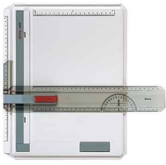 fixiert des Zeichenpapieres mit Magnetklemmleisten auf schlagfesten Plattenkörper. Das "L-System" erlaubt auch im unteren Blattbereich ein Zeichnen oberhalb der Zeichenschiene.